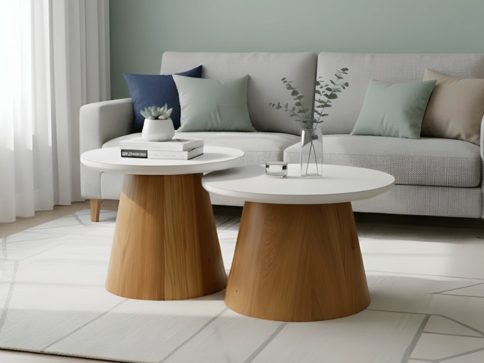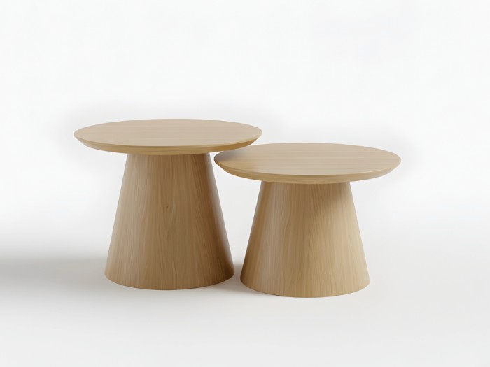 Mesas de centro, elaboradas en madera roble Flor morado, Con cubierta en chapilla ó pintada en poliuretano blanco. *Opción de cubierta a elección del cliente.